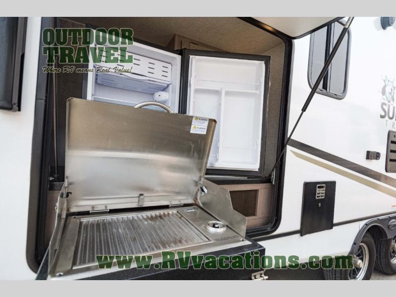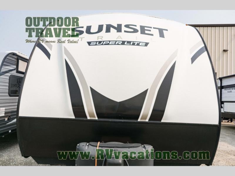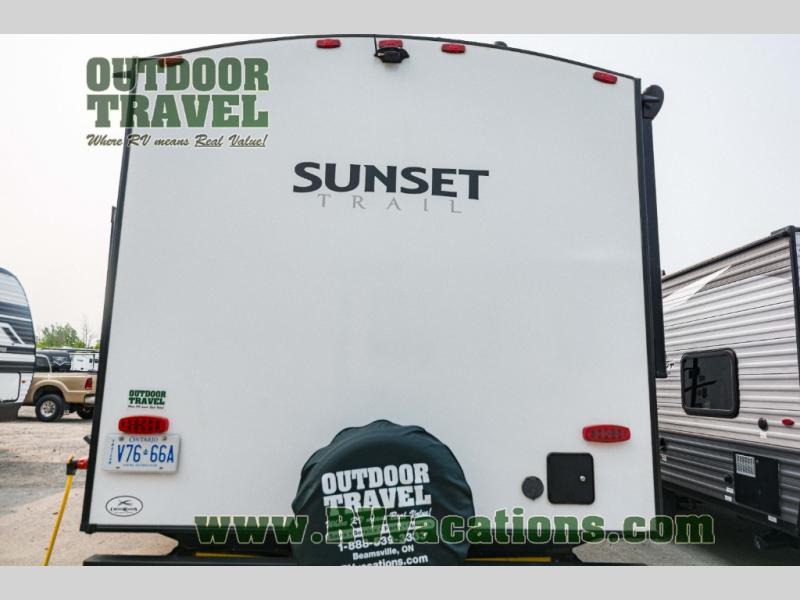 With any Sunset Trail travel trailer by CrossRoads RV, the interior offers a stainless steel farmhouse single bowl sink with a cover, solid surface countertops in the kitchen, a 12 volt refrigerator, USB ports in the bedroom and main area, and a Connexx entertainment TV with soundbar for inside enjoyment. Also included is the Extreme Weather package with maximum insulation with reflective foil, a 30,000 BTU furnace, and a 2″ heat duct in the enclosed underbelly for four seasons of traveling. And the Blade Air system offers 20% more airflow and re-engineered components on the A/C. The HyperDeck flooring is water resistant, fiberglass reinforced and has polypropylene layers. Make your lightweight and comfortable RV decision today!