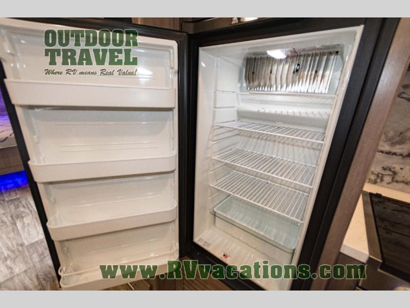 You will love the added interior space you have in this travel trailer thanks to the large slide out in the main living area. Here, you’ll enjoy playing cards at the XL booth dinette and relaxing on the tri-fold sofa. Make home-cooked meals on the glass top range or use the exterior camp kitchen. There is even an exterior refrigerator for cold drinks, and the power awning will shade you from the hot summer sun. This model features a full rear bath for added privacy, and the shower skylight will allow natural light in. The front private bedroom includes a king bed, dual wardrobes, plus a shoe storage and pet station for your convenience!